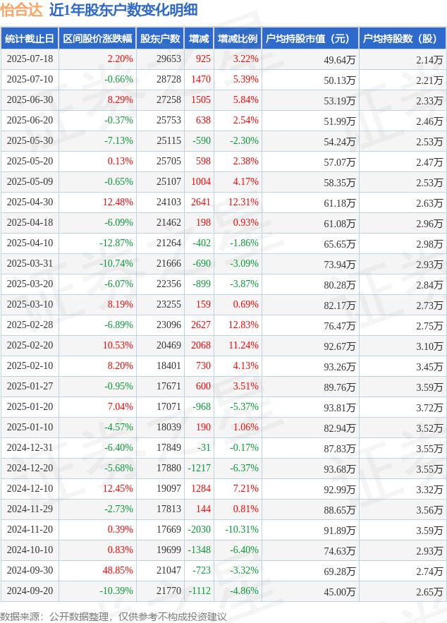 从股价来看,2025年7月10日至2025年7月18日,怡合达区间涨幅为2.2%,在此期间股东户数增加925.0户,增幅为3.22%。